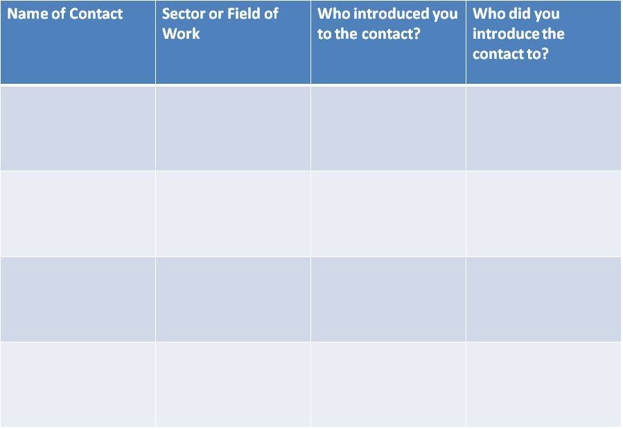 In the contact column list the names of your top 10-15 contacts, and in the subsequent columns follow suit beginning with what sector or company they work in and so forth. This will allow you to determine how you met your contacts and what fields you’re connected with. If you find that you have introduced yourself to the bulk of your contacts your network may be inbred as a result of your introducing yourself to people you personally are drawn to. On the other hand if you find you’ve got a network where all your key contacts are from differing sectors your network may be too diversified and diluted. You should aim to have about 2 contacts in each of your varying sectors.